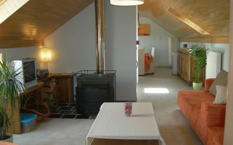 A l’étage, une salle à manger, une cuisine avec lave-vaisselle, fours traditionnel et micro-ondes, plaques vitrocéramiques et hotte, jouxtent un salon confortable avec poêle à bois, Tv, Proximus tv, Dvd, Hi-Fi, Wifi et câble ADSL. Une troisième chambre avec deux lits simples et un lit superposé est équipée d’une salle de bain (douche, évier, wc), ainsi qu’une prise ADSL.